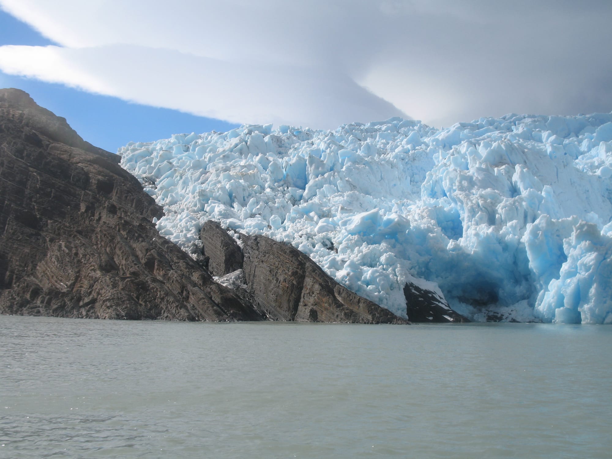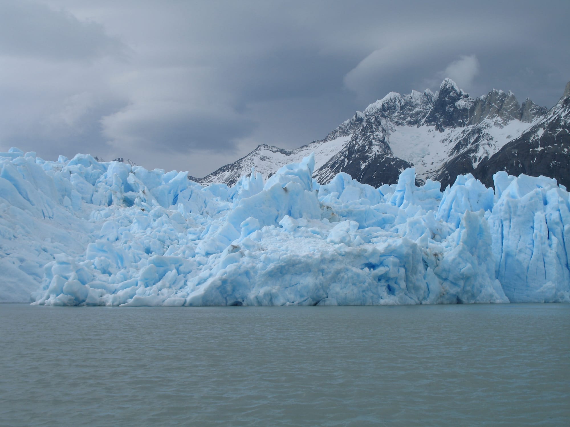 Lago Grey was a silver-gray mirror with a surface brushed roughly by the wind, dotted with chunks of glowing blue. Our journey, from Zodiac to tour boat and back again, was one of the roughest of my life, awash in giant waves and hurricane-force blasts off the ice field.