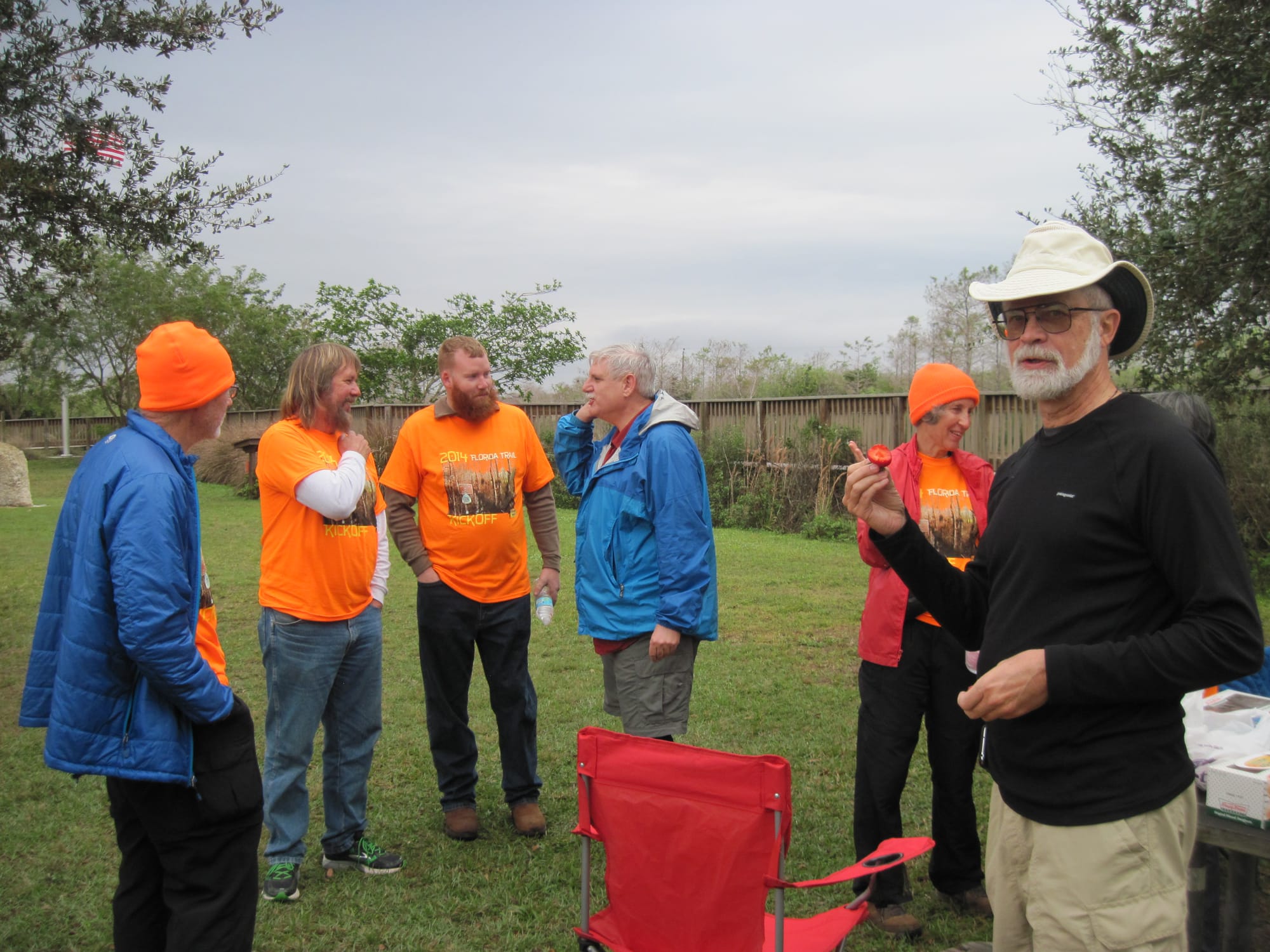 After breakfast the next morning we caravanned to Oasis, all wearing our bright orange 2014 FT hiker kickoff t-shirts. It was an idea of Sandy's that grew into a custom designed shirt. Using requests from a few of the 2013 FT hikers, she added a gator, a water moccasin, and a few other surprises to a photo I took last year while walking with the group in the swamp, and made it a work of art.