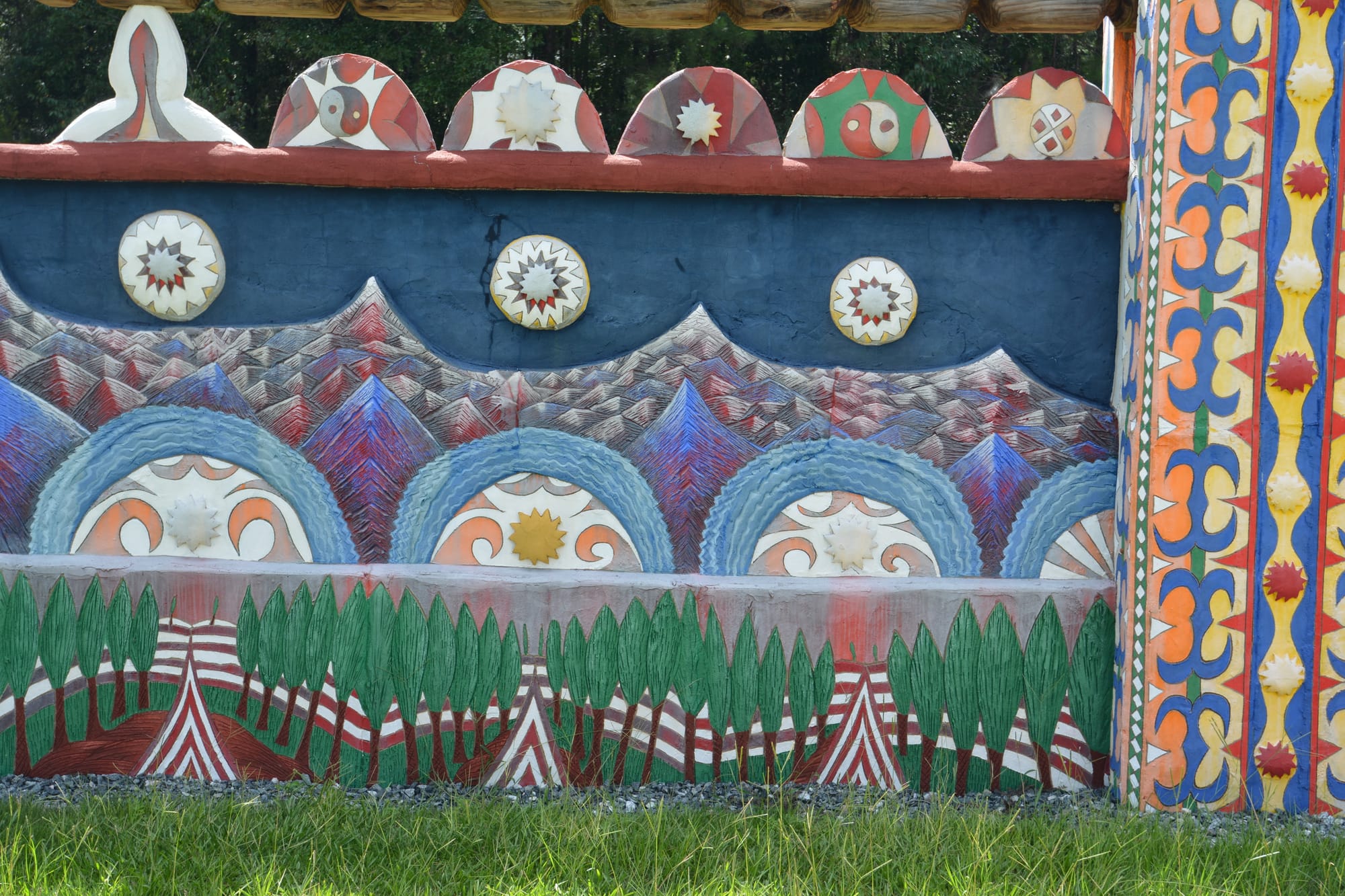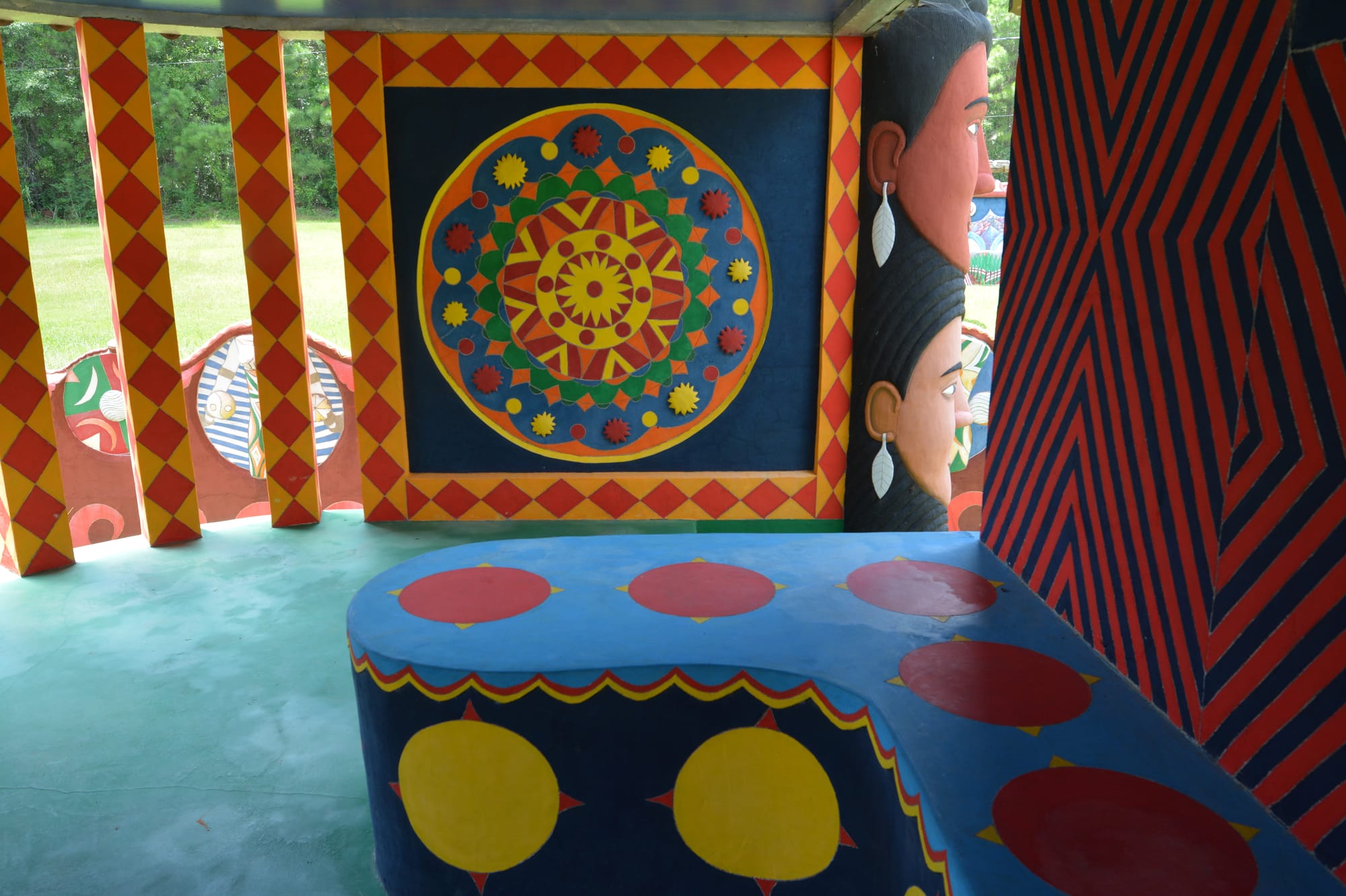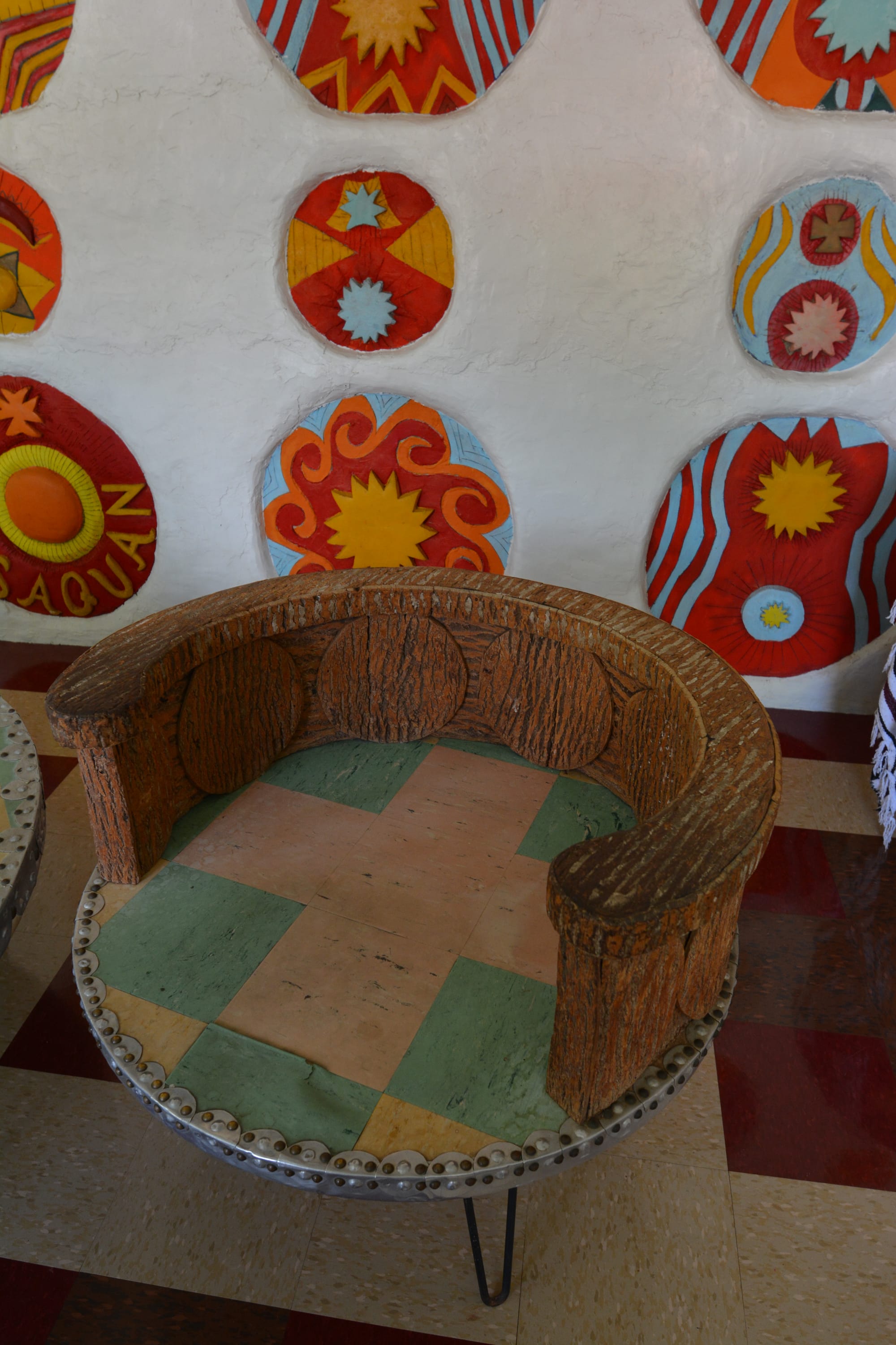 We were fortunate to enjoy a tour with a docent who often dresses as Eddie would have when he and his acolytes inhabited and built this unique work of art. The colors and textures are earthy, repainted regularly to their original vibrancy.