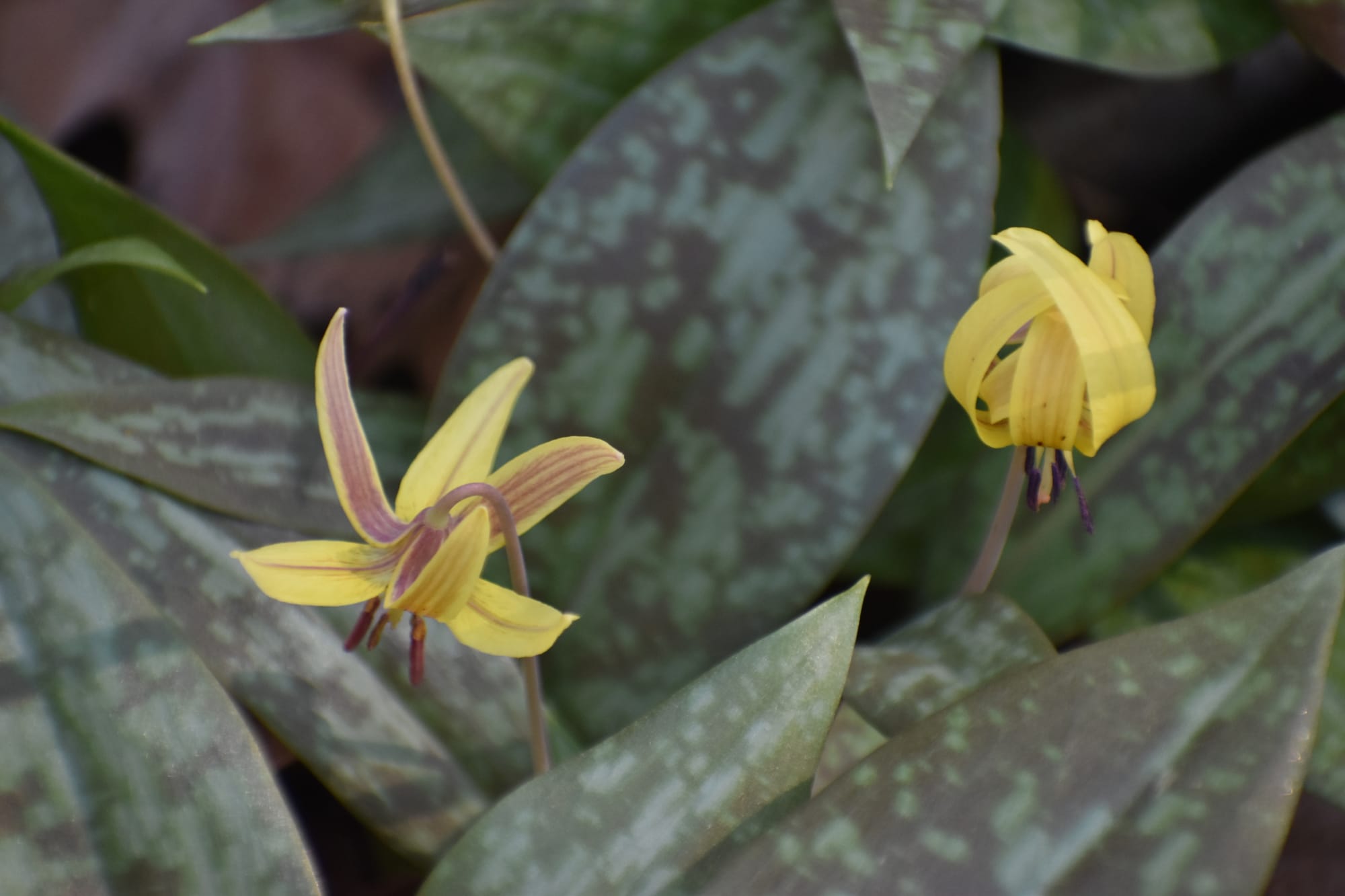 A descent down the folded hills towards the creek basin winds amid splashes of trillium until the forest floor shifts, carpeted in the mottled leaves and buttery blossoms of trout lilies downslope to the creek, extending like a ribbon above it.